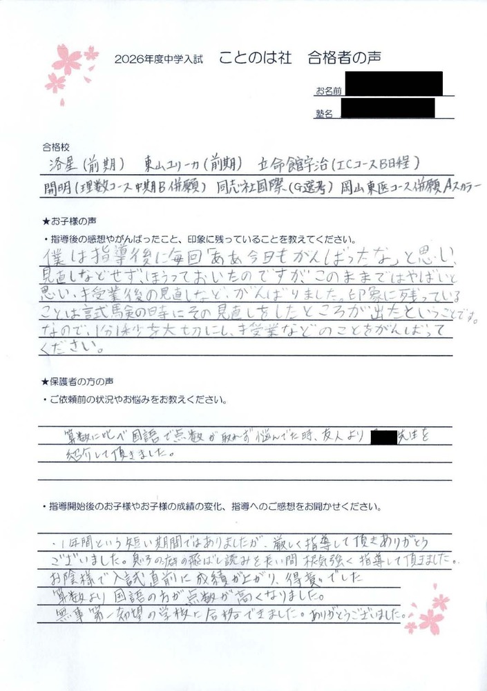 岡山中学校入試(前受け): 国語で92点という高得点を獲得。国語が苦手だと思われていましたが、国語でこれほどの点数を取ったことに、塾の先生も驚愕されていました。
